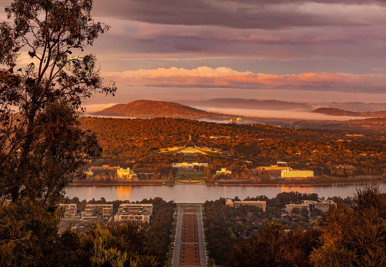 Canberra, die von Grünflächen umgebene Hauptstadt Australiens, ist von Anfang an als perfekte Symbiose aus Natur und Kultur konzipiert worden. Statt lärmender Hochhäuser gibt es hier weite Seen, ausgedehnte Wälder und Architektur mit künstlerischem Flair.